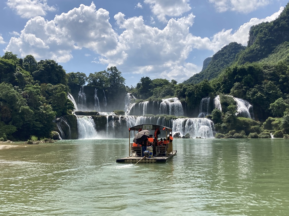 On the third day, the group, refreshed after a night's rest, had breakfast and took a bamboo raft to explore the rural scenery of Mingshi, known as "Little Guilin". The Mingshi River twists and turns, with an array of mountains on both sides of the river. Crossing the Mingshi Bridge, everyone is immersed in the beautiful scenery of Jiangnan. At noon that day, we had lunch at the Mingshi Farm Restaurant. Everyone set off to the next destination, visiting Detian Waterfall. This waterfall is the world's second largest transnational waterfall located on the China-Vietnam border. It straddles China and Vietnam. It is the first and second largest transnational waterfall in Asia and the world. It originates from the Guichun River in Jingxi County, Guangxi. It has water all year round. It flows into Vietnam and back to Guangxi. It passes through Detian Village in Daxin County and falls off a cliff to form a waterfall.
